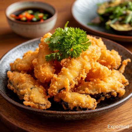 Хрустящие баклажаны темпура: лёгкость и изысканность в каждой порции Хрустящие баклажаны темпура — это блюдо, которое привлекает своей лёгкой текстурой, ярким вкусом и эффектной подачей. Оно сочетает в себе традиции японской кухни и современные гастрономические тенденции, предлагая гостям интересный и визуально привлекательный вариант овощной закуски. Темпура позволяет раскрыть естественный вкус баклажанов, при этом придавая им хрустящую золотистую корочку, что делает блюдо одновременно утончённым и насыщенным. Баклажаны — главный ингредиент блюда — выбирают тщательно, отдавая предпочтение молодым плодам с плотной мякотью и тонкой кожицей. Молодые баклажаны обладают мягким вкусом и минимальной горчинкой, что идеально подходит для жарки в кляре. Нарезанные ломтики или полоски баклажанов предварительно слегка солят, чтобы удалить лишнюю влагу и подчеркнуть естественный вкус овоща. Этот шаг помогает сохранить текстуру баклажана, делая его нежным внутри после жарки. Особенностью блюда является кляр для темпуры. Традиционный кляр готовят из лёгкого теста на основе холодной воды и муки, иногда добавляют яйцо и кукурузный или рисовый крахмал для дополнительной хрусткости. Главное — сохранять тесто холодным и не перемешивать его слишком долго, чтобы оно оставалось воздушным. Когда баклажаны обмакивают в кляр и обжаривают во фритюре, они покрываются тонкой золотистой корочкой, которая хрустит при каждом укусе, создавая контраст с мягкой сердцевиной овоща. Жарка во фритюре при правильной температуре масла позволяет сохранить свежесть баклажана, не делая его жирным. Температура около 170–180 °C обеспечивает равномерное приготовление и золотистую корочку, при этом баклажан внутри остаётся нежным и сочным. После жарки баклажаны выкладывают на бумажные салфетки, чтобы убрать лишнее масло, сохраняя лёгкость и воздушность блюда. Подача хрустящих баклажанов темпура имеет большое значение. Обычно их сервируют горячими, дополняя свежими травами, тонким соусом на основе соевого соуса, мёда или цитрусовых нот, что подчёркивает японский характер блюда и добавляет вкусовые акценты. Эстетичная подача в небольших порционных тарелках или на бамбуковых подставках делает блюдо особенно привлекательным для ресторанного меню. Хрустящие баклажаны темпура — это пример того, как простые овощи могут превратиться в изысканное и яркое блюдо. Они сочетают в себе контраст текстур, лёгкость приготовления и визуальную привлекательность, оставляя после себя ощущение свежести и гастрономического удовольствия. Этот вариант закуски станет отличным выбором для тех, кто ценит утончённый вкус, хруст и гармонию традиций и современных кулинарных идей. __________________________________________________________________________________________________________________________ Crispy Tempura Eggplants: Lightness and Elegance in Every Bite Crispy tempura eggplants are a dish that captivates with their light texture, vibrant flavor, and striking presentation. They combine the traditions of Japanese cuisine with modern gastronomic trends, offering guests an interesting and visually appealing vegetable appetizer. Tempura allows the natural taste of the eggplants to shine while giving them a crisp, golden crust, making the dish both delicate and flavorful. Eggplants, the main ingredient, are carefully selected, with preference given to young fruits with firm flesh and thin skin. Young eggplants have a mild taste and minimal bitterness, which is ideal for frying in batter. Sliced into rounds or strips, the eggplants are lightly salted beforehand to remove excess moisture and enhance their natural flavor. This step helps maintain the texture, keeping the interior tender after frying. The hallmark of the dish is the tempura batter. Tradition