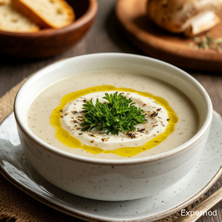 Крем-суп из шампиньонов с трюфельным маслом: аромат и изысканность в каждой ложке Крем-суп из шампиньонов с трюфельным маслом — это блюдо, которое сочетает в себе нежность текстуры, насыщенный грибной вкус и утончённый аромат трюфеля. Такой суп идеально подходит как для повседневного обеда, так и для праздничного ужина, создавая атмосферу комфорта и гастрономического удовольствия. Его бархатистая консистенция и богатый вкус делают каждую порцию настоящим наслаждением для гурманов и ценителей изысканной кухни. Основой супа являются свежие шампиньоны. Эти грибы обладают мягким и деликатным вкусом, который прекрасно раскрывается при лёгкой обжарке. Перед приготовлением шампиньоны тщательно моют, очищают и нарезают пластинками. Лёгкая обжарка с небольшим количеством сливочного масла или оливкового масла позволяет раскрыть аромат грибов и усилить их естественный вкус, сохранив при этом нежную текстуру. Кремовая структура супа достигается за счёт сочетания овощного бульона, сливок и иногда мягкого картофеля или лука, которые добавляют блюду бархатистости. Все ингредиенты после варки тщательно измельчаются блендером, превращаясь в однородное кремовое пюре. Этот процесс позволяет получить гладкую, шелковистую консистенцию, которая плавно обволакивает вкус грибов и создаёт ощущение лёгкости при употреблении. Особый акцент в супе придаёт трюфельное масло. Его насыщенный, глубокий аромат делает блюдо необыкновенно изысканным и роскошным. Даже небольшая капля трюфельного масла способна полностью преобразить вкус крем-супа, добавив ему нотки лесного аромата и деликатной землистости. Часто трюфельное масло используют в качестве финального штриха перед подачей, чтобы сохранить его насыщенный запах и подчеркнуть тонкость вкусового ансамбля. Важным элементом является и подача супа. Крем-суп подают горячим в небольших порционных мисках или тарелках, иногда с добавлением обжаренных грибов, хрустящих гренок или капельки сливок для визуального и вкусового акцента. Свежая зелень или тонкие листочки петрушки могут дополнительно украсить блюдо, создавая эстетическое удовольствие ещё до первого укуса. Крем-суп из шампиньонов с трюфельным маслом — это пример того, как простые ингредиенты могут превратиться в изысканное гастрономическое блюдо. Он сочетает нежность, аромат и насыщенный вкус, создавая гармонию текстур и запахов. Этот суп идеально подходит для ценителей утончённой кухни, желающих насладиться лёгкой, но насыщенной по вкусу едой. Каждая ложка дарит ощущение тепла, комфорта и гастрономического совершенства, делая крем-суп из шампиньонов с трюфельным маслом настоящим украшением любого стола. ____________________________________________________________________________________________________________________ Cream of Mushroom Soup with Truffle Oil: Aroma and Sophistication in Every Spoonful Cream of mushroom soup with truffle oil is a dish that combines a delicate texture, rich mushroom flavor, and the refined aroma of truffle. This soup is perfect for both an everyday lunch and a festive dinner, creating an atmosphere of comfort and gastronomic delight. Its velvety consistency and deep taste make each serving a true pleasure for gourmets and lovers of sophisticated cuisine. The base of the soup is fresh mushrooms. These mushrooms have a soft and delicate flavor that develops beautifully when lightly sautéed. Before cooking, the mushrooms are carefully washed, cleaned, and sliced. A light sauté in a small amount of butter or olive oil allows the aroma of the mushrooms to unfold and enhances their natural taste while preserving their tender texture. The creamy structure of the soup is achieved through a combination of vegetable broth, cream, and sometimes soft potatoes or onions, which add smoothness and richness. Aft