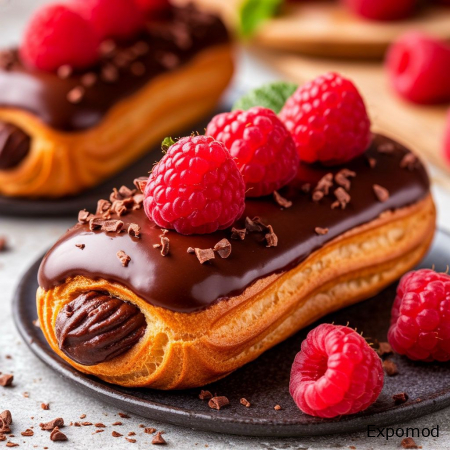 Эклеры с шоколадным кремом и малиной: нежность и насыщенный вкус в каждой порции Эклеры с шоколадным кремом и малиной — это изысканный десерт, который покоряет своей гармонией вкусов, нежностью текстуры и яркой визуальной презентацией. Они идеально подходят для праздничного стола, торжественного чаепития или утреннего кофе, превращая обычный момент в маленький гастрономический праздник. Сочетание хрустящей оболочки из заварного теста, насыщенного шоколадного крема и свежей, слегка кисловатой малины делает этот десерт по-настоящему незабываемым. Основой эклера является заварное тесто. Его уникальная структура позволяет создать лёгкую и воздушную оболочку с тонкой хрустящей корочкой, внутри которой образуется пустое пространство для начинки. Тесто готовят из воды, молока, масла, муки и яиц, тщательно соблюдая технологию, чтобы добиться идеального баланса между плотностью и воздушностью. При правильном приготовлении эклеры не опадают после выпечки и сохраняют форму, создавая основу для изысканного десерта. Шоколадный крем — сердце эклера. Для него используют качественный тёмный или молочный шоколад, сливки, сахар и яйца. Крем варят или взбивают до получения гладкой, бархатистой текстуры, которая идеально держит форму при наполнении эклера. Шоколадный крем добавляет десерту насыщенность, глубину вкуса и мягкость, создавая контраст с хрустящей оболочкой теста. Иногда в крем добавляют ваниль или ликёр, чтобы придать дополнительную нотку аромата и уникальности. Малина — это свежий акцент, который завершает десерт. Её лёгкая кислинка уравновешивает сладость шоколада, добавляя яркости и свежести вкусу эклера. Ягоды можно использовать целыми или в виде пюре, смешивая их с кремом, чтобы каждая ложка дарила гармонию сладкого и кисловатого вкуса. Малина также делает десерт визуально привлекательным: её яркий красный цвет контрастирует с тёмным шоколадом, создавая праздничный и аппетитный вид. Важным элементом эклера является его оформление. Верхнюю часть десерта украшают шоколадной глазурью, посыпкой или тонкой сеточкой карамели. Иногда используют свежие ягоды и листочки мяты, создавая эстетически привлекательную композицию. Красивое оформление делает эклеры не только вкусными, но и привлекательными для глаз, превращая их в идеальный десерт для подачи на стол гостям или в кафе. Подача эклеров с шоколадным кремом и малиной требует аккуратности и внимания к деталям. Десерт подают охлаждённым, чтобы крем сохранял форму, а ягоды оставались свежими. Эклеры выкладывают на красивые тарелки, иногда с капельками шоколадного или малинового соуса для дополнения вкуса и усиления визуального эффекта. Такая подача подчёркивает изысканность и мастерство приготовления, делая десерт настоящим гастрономическим шедевром. Эклеры с шоколадным кремом и малиной — это символ утончённого вкуса, гармонии текстур и вкусовых контрастов. Они сочетают хрустящую оболочку, мягкий шоколадный крем и свежую малину, создавая полное гастрономическое удовольствие. Этот десерт подходит для любого случая, от уютного чаепития до праздничного торжества, радуя гостей своей эстетикой, ароматом и насыщенным вкусом. Каждое пирожное дарит удовольствие, тепло и ощущение праздника, превращая обычный момент в маленькое кулинарное торжество. ___________________