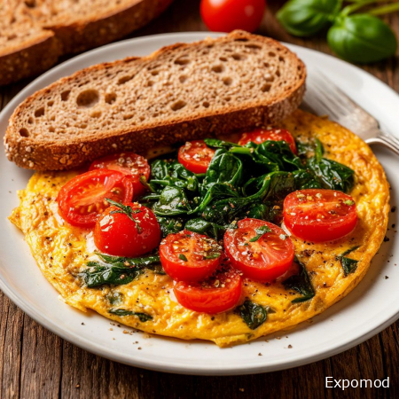 Омлет с помидорами и шпинатом в сочетании с цельнозерновым хлебом — это простой, но питательный вариант завтрака, который помогает начать день с ощущением лёгкости и энергии. Такое блюдо ценится не только за скорость приготовления, но и за сбалансированный состав, способный поддерживать работоспособность и хорошее самочувствие на протяжении нескольких часов. Основой блюда является омлет — универсальный способ приготовления яиц, позволяющий сохранить их нежную текстуру и естественный вкус. Яйца считаются одним из наиболее доступных источников полноценного белка, необходимого для восстановления тканей и поддержания мышечного тонуса. При правильном приготовлении омлет получается воздушным и мягким. Важно готовить его на умеренном огне, чтобы структура оставалась нежной, а вкус — насыщенным. Помидоры придают блюду сочность и лёгкую кислинку, благодаря чему вкус становится более ярким и свежим. Во время тепловой обработки они раскрывают аромат и делают омлет менее тяжёлым для восприятия. Шпинат, в свою очередь, добавляет не только цветовой контраст, но и дополнительную пищевую ценность. Он богат витаминами и микроэлементами, а также хорошо сочетается с яйцами, создавая гармоничный баланс вкуса. Листья шпината достаточно слегка прогреть, чтобы сохранить их мягкость и полезные свойства. Не менее важную роль играет цельнозерновой хлеб. В отличие от белого хлеба, он содержит больше пищевых волокон, которые способствуют длительному чувству сытости и поддерживают стабильный уровень энергии. Лёгкая поджарка делает хлеб ароматным и добавляет приятную хрустящую текстуру, контрастирующую с мягкостью омлета. Такой гарнир превращает блюдо из лёгкой закуски в полноценный приём пищи. Особенность этого сочетания заключается в его практичности. Ингредиенты доступны в любое время года, а сам процесс приготовления не требует сложных кулинарных навыков. При желании рецепт легко адаптировать: добавить немного сыра, зелени или специй, чтобы подчеркнуть индивидуальные вкусовые предпочтения. Омлет с помидорами и шпинатом вместе с цельнозерновым хлебом демонстрирует, что полезный завтрак не обязательно должен быть сложным или долгим в приготовлении. Это пример еды, которая сочетает комфорт, натуральность и пользу, формируя привычку осознанного питания и помогая поддерживать активный ритм жизни. ____________________________________________________________________________________________________________ An omelet with tomatoes and spinach served with whole-grain bread is a simple yet nutritious breakfast option that helps start the day with a feeling of lightness and energy. This dish is valued not only for its quick preparation but also for its balanced composition, which supports productivity and well-being for several hours. The foundation of the meal is the omelet — a versatile way of cooking eggs that preserves their delicate texture and natural flavor. Eggs are considered one of the most accessible sources of high-quality protein, essential for tissue repair and maintaining muscle tone. When prepared properly, an omelet becomes soft and airy. Cooking it over moderate heat is important, as it helps keep the texture tender while allowing the flavor to remain rich and satisfying. Tomatoes add juiciness and a slight acidity, making the taste brighter and fresher. During cooking, they release their aroma and help the dish feel lighter. Spinach, in turn, contributes not only a vibrant color but also additional nutritional value. It is rich in vitamins and micronutrients and pairs well with eggs, creating a harmonious balance of flavors. The spinach leaves need only a brief heating to retain their softness and beneficial qualities. Whole-grain bread plays an equally important role in this combination. Unlike white bread, it contains more dietary fiber, which promotes longer satiety and helps maintain stable energy levels. Lightly toasting the bread enhances its aroma and adds a pleasant crunch that contrasts with the softness of the omelet. This element transforms the dish from a light snack into 