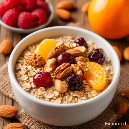 Овсянка с орехами и фруктами — это классический пример питательного и сбалансированного завтрака, который подходит для людей любого возраста. Она сочетает в себе медленные углеводы, необходимые для поддержания энергии, полезные жиры из орехов и натуральную сладость фруктов, создавая гармоничное и вкусное начало дня. Такой завтрак не только насыщает, но и помогает улучшить обмен веществ и поддерживать стабильный уровень сахара в крови. Основой блюда является овсяная крупа — продукт, известный своим высоким содержанием клетчатки и медленных углеводов. Клетчатка помогает улучшить пищеварение, очищает организм и способствует длительному ощущению сытости. Овсянку можно готовить как на воде, так и на молоке или растительных напитках, в зависимости от вкусовых предпочтений и потребностей организма. Правильное приготовление позволяет сохранить мягкую кремовую текстуру и естественный ореховый вкус крупы. Орехи добавляют овсянке не только хрустящую текстуру, но и полезные жиры, витамины и минералы. Миндаль, грецкие орехи, кешью или фундук обеспечивают организм омега-3 и омега-6 жирными кислотами, которые поддерживают работу сердца и сосудов. Помимо пользы для здоровья, орехи придают завтраку насыщенность и приятный аромат, делая его более сытным и питательным. Фрукты в овсянке добавляют естественную сладость, свежесть и витаминный заряд. Бананы, яблоки, ягоды или киви отлично сочетаются с крупой и орехами, создавая разнообразие вкусов и цветов. Фрукты также обогащают завтрак антиоксидантами, клетчаткой и природными сахарами, которые быстро усваиваются, но при этом не вызывают резких скачков уровня глюкозы в крови. При желании овсянку можно разнообразить дополнительными ингредиентами. Семена чиа, тыквенные семечки, кокосовая стружка или немного мёда подчеркнут вкус и сделают завтрак ещё более питательным и интересным. Важный секрет — добавлять орехи и фрукты в уже готовую кашу, чтобы они сохранили свой натуральный вкус и текстуру. Овсянка с орехами и фруктами — это универсальное решение для завтрака, которое подходит и для домашнего приготовления, и для быстрого перекуса на работе. Она демонстрирует, как простые и натуральные ингредиенты могут создавать полноценный и вкусный приём пищи, поддерживающий здоровье и активность на протяжении всего дня. Такой завтрак помогает формировать привычку осознанного питания и становится отличным стартом к продуктивному дню. _____________________________________________________________________________________________________________________ Oatmeal with nuts and fruits is a classic example of a nutritious and balanced breakfast suitable for people of all ages. It combines slow-digesting carbohydrates, essential for sustaining energy, healthy fats from nuts, and the natural sweetness of fruits, creating a harmonious and flavorful way to start the day. This breakfast not only satisfies hunger but also helps improve metabolism and maintain stable blood sugar levels. The foundation of the dish is oatmeal — a product known for its high fiber content and slow-digesting carbohydrates. Fiber supports digestion, helps cleanse the body, and promotes a lasting feeling of fullness. Oatmeal can be prepared with water, milk, or plant-based alternatives, depending on taste preferences and dietary needs. Proper cooking preserves a soft, creamy texture and brings out the grain’s natural nutty flavor. Nuts add not only a satisfying crunch but also healthy fats, vitamins, and minerals. Almonds, walnuts, cashews, or hazelnuts provide omega-3 and omega-6 fatty acids that support heart and vascular health. Besides their nutritional benefits, nuts make the breakfast more filling and aromatic, enhancing its overall appeal. Fruits bring natural sweetness, freshness, and a vitamin boost to the oatmeal. Bananas, apples, berries, or kiwi pair perfectly with the grains and nuts, creating a variety of flavors and colors. Fruits also enrich the breakfast with antioxidants, fiber, and natural sugars that are q