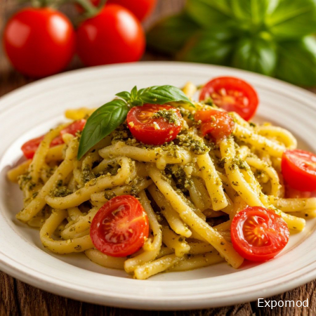 Паста с соусом песто и томатами черри — это одно из тех блюд, которое сочетает в себе простоту приготовления, насыщенный вкус и пользу для организма. Оно идеально подходит для обеда или ужина, когда хочется лёгкой, но сытной еды, способной зарядить энергией и подарить удовольствие от каждого кусочка. Такой рецепт демонстрирует гармонию традиционной итальянской кухни и современных здоровых подходов к питанию. Основу блюда составляет паста, которую можно выбрать на свой вкус: спагетти, фузилли, пенне или тальятелле. Важный момент — правильное приготовление макарон. Они должны быть аль денте, то есть сохранять лёгкую упругость. Такой способ варки не только подчёркивает вкус самой пасты, но и помогает лучше усваивать углеводы, обеспечивая долгую сытость. После варки макароны лучше слегка сбрызнуть оливковым маслом, чтобы они не слипались и сохраняли мягкую текстуру. Соус песто является сердцем этого блюда. Он готовится на основе свежего базилика, оливкового масла, кедровых орешков и сыра Пармезан. Песто обладает насыщенным ароматом и ярким зелёным цветом, который сразу привлекает взгляд. Основная особенность соуса — его свежесть и натуральность: при минимальной термической обработке сохраняются все полезные вещества, витамины и антиоксиданты базилика, а оливковое масло добавляет полезные мононенасыщенные жиры. Томаты черри придают пасте сочность и лёгкую сладость, создавая идеальный контраст с насыщенным песто. Они также богаты витамином C, антиоксидантами и клетчаткой, что делает блюдо не только вкусным, но и полезным. Черри достаточно слегка обжарить на сковороде или добавить в готовую пасту в свежем виде — это зависит от желаемой текстуры и вкуса. Для придания дополнительного аромата и текстуры к пасте можно добавить свежую зелень, немного чеснока или слегка поджаренные орешки. Такая небольшая деталь делает блюдо более сложным и интересным, при этом сохраняя его лёгкость. Главное достоинство пасты с соусом песто и томатами черри — универсальность. Она подходит и для повседневного ужина, и для угощения гостей. Блюдо легко адаптируется под индивидуальные вкусовые предпочтения: можно менять вид пасты, экспериментировать с количеством песто или добавлять дополнительные овощи. Паста с песто и томатами черри демонстрирует, что здоровая и вкусная еда может быть простой, быстрой в приготовлении и одновременно эстетичной. Это блюдо поддерживает баланс белков, жиров и углеводов, обеспечивает организм полезными веществами и дарит наслаждение от каждой порции, делая приём пищи полноценным и радостным. _________________________________________________________________________________________________________________ Pasta with pesto sauce and cherry tomatoes is one of those dishes that combines simplicity of preparation, rich flavor, and nutritional benefits. It is perfect for lunch or dinner when you want a light yet satisfying meal that provides energy and delights with every bite. This recipe demonstrates the harmony of traditional Italian cuisine and modern healthy eating approaches. The foundation of the dish is pasta, which can be chosen according to your preference: spaghetti, fusilli, penne, or tagliatelle. An important aspect is cooking the pasta correctly. It should be cooked al dente, meaning it retains a slight firmness. This not only highlights the flavor of the pasta itself but also helps the body better absorb carbohydrates, keeping you full for longer. After cooking, it’s best to lightly drizzle the pasta with olive oil to prevent sticking and maintain a soft texture. Pesto sauce is the heart of this dish. It is made from fresh basil, olive oil, pine nuts, and Parmesan cheese. Pesto has an intense aroma and a bright green color that immediately draws attention. The main feature of the sauce is its freshness and naturalness: minimal heat preserves all the nutrients, vitamins, and antioxidants from 
