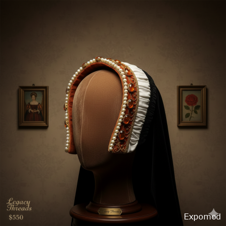 The "Tudor Rose" French Hood is an iconic piece of 16th-century millinery, representing the height of feminine elegance at the courts of Henry VIII and Elizabeth I. Originally introduced to the English court by Anne Boleyn, the French hood revolutionized women's fashion by shifting away from the conservative, face-framing gable hoods toward a more alluring, crescent-shaped silhouette that sat further back on the head, exposing the wearer's hair. At Legacy Threads, we have meticulously recreated this headpiece to capture the delicate balance of structural rigidity and ornamental opulence. The foundation of the "Tudor Rose" is a hand-molded "paste" or buckram frame, carefully shaped into the classic horseshoe curve that sits elegantly atop the crown. This frame is covered in rich, burnt-sienna velvet, providing a textured contrast to the smoothness of the hair. The most striking feature is the 'billiment'—the decorative border along the front edge. Our artisans have hand-sewn a double row of alternating cream freshwater pearls and gold-set amber stones, creating a radiant halo effect that frames the face with warmth. Each stone is secured with fine gold wire, following techniques found in 16th-century jewelry making. Attached to the back of the hood is a "coif" of fine pleated linen and a flowing "veil" made of heavy black silk velvet. This veil, known as the "falle," is designed to hang straight down the back, providing a stark, sophisticated contrast to the warm tones of the front embroidery. To ensure a secure fit, the hood features an internal "crépine"—a decorative caul or net made of gold silk cord—that holds the gathered hair in place at the nape of the neck. The side pieces, or "lappets," are lined with a cream-colored silk satin, adding a hidden touch of luxury that only the wearer truly appreciates. This French Hood is more than a simple accessory; it is a symbol of the cultural shift toward Renaissance humanism and the celebration of individual beauty. At Legacy Threads, we ensure that every hood is balanced for weight, allowing it to be worn with the same effortless dignity as the queens of old. It is an essential acquisition for historical reenactors, collectors of period jewelry, and costume designers seeking the definitive finishing touch for a high-status 16th-century ensemble. ________________________________________________________________________________________________________________________ Французский капюшон «Тюдорская роза» — это знаковый предмет дамского головного убора XVI века, олицетворяющий вершину женской элегантности при дворах Генриха VIII и Елизаветы I. Впервые представленный английскому двору Анной Болейн, французский капюшон совершил революцию в женской моде, сменив консервативные, закрывающие лицо «фронтоны» (gable hoods) на более соблазнительный силуэт в форме полумесяца. Этот убор располагался дальше на затылке, открывая взору прическу владелицы. В Legacy Threads мы тщательно воссоздали этот аксессуар, чтобы передать тонкий баланс между структурной жесткостью и орнаментальной роскошью. Основой «Тюдорской розы» служит вылепленный вручную каркас из проклеенного полотна, которому придана классическая подковообразная форма, элегантно сидящая на макушке. Каркас обтянут богатым бархатом цвета жженой сиены, создающим текстурный контраст с гладкостью волос. Самая поразительная деталь — «биллимент» (декоративная кайма по переднему краю). Наши мастера вручную пришили двойной ряд чередующихся кремовых пресноводных жемчужин и янтарных камней в золотой оправе, создавая эффект сияющего нимба, который тепло обрамляет лицо. Каждый камень закреплен тонкой золотой проволокой в соответствии с ювелирными техниками XVI века. К задней части капюшона прикреплен «чепец» из тонкого плиссированного льна и струящаяся «вуаль» из тяжелого черного шелкового бархата. Эта вуаль, известная как «falle», спадает прямо по спине, создавая строгий и изысканный контраст с теплыми тонами передней вышивки. Для надежной фиксации капюшон дополнен внутренним «крепином» — декоративной сеткой из золотого шелкового шнура, которая удерживает собранные волосы на затылке. Боковые части, или «лаппеты», подбиты шелковым сатином кремового цвета — скрытый штрих роскоши, который по-настоящему ценит только сама владелица. Этот французский капюшон — больше чем просто аксессуар; это символ культурного перехода к ренессанс