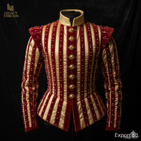 The "Henry's Lion" doublet is a masterpiece of mid-16th-century English tailoring. Inspired by the opulent wardrobe of Henry VIII, this garment defines the masculine silhouette of the Tudor court—broad shoulders, a structured chest, and meticulous attention to detail. The doublet is crafted from heavy crimson silk velvet, reinforced with a hidden canvas structure to maintain its architectural form. The chest and sleeves are adorned with "slashes"—precise decorative cuts that reveal a contrasting under-layer of pale gold satin. Each slash is edged with hand-stitched silk thread and tiny seed pearls. The high standing collar is stiffened and lined with gold brocade. Down the center, the garment is fastened with a row of bespoke buttons: each one is a miniature gold-plated lion’s head with "amber-resin" eyes. This doublet is designed for the modern individual who seeks to embody the power and presence of a Tudor sovereign. Keywords: Tudor doublet, 16th century men's fashion, Crimson silk velvet, Slashed sleeve design, Renaissance tailoring, Henry VIII style, Gold brocade, Seed pearls, Historical costume, Luxury menswear. __________________________________________________________________________________________________________________________________ Дублет «Лев Генриха» — это шедевр английского портновского искусства середины XVI века. Вдохновленный роскошным гардеробом Генриха VIII, этот предмет одежды определяет классический мужской силуэт двора Тюдоров: широкие плечи, структурированная грудь и маниакальное внимание к деталям. Дублет изготовлен из тяжелого малинового шелкового бархата, укрепленного скрытым каркасом для поддержания его архитектурной формы. Грудь и рукава украшены «разрезами» — декоративными прорезями, сквозь которые виден контрастный слой бледно-золотистого атласа. Каждый разрез по краям обработан вручную шелковой нитью и расшит мелким речным жемчугом. Высокий воротник-стойка уплотнен и подбит золотой парчой. По центру изделие застегивается на ряд эксклюзивных пуговиц: каждая представляет собой миниатюрную позолоченную львиную голову с глазами из «янтарной смолы». Этот дублет создан для тех, кто стремится воплотить в себе мощь и величие монарха эпохи Тюдоров. Ключевые слова: дублет Тюдоров, мужская мода XVI века, малиновый шелковый бархат, дизайн с разрезами, портновское искусство Ренессанса, стиль Генриха VIII, золотая парча, речной жемчуг, исторический костюм, роскошная мужская одежда. ___________________________________________________________________________________________________________________________________ expomod.kz