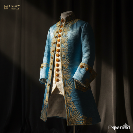 The "Versailles Noon" Justacorps is a pinnacle of the late 17th-century French court style. By the 1670s, the justacorps(literally "close to the body") had become the definitive garment for the French aristocracy, establishing a silhouette of absolute elegance and rigid social standing. This coat is tailored from heavy, sky-blue silk moiré—a fabric that reflects light like moving water, mimicking the fountains of the Versailles gardens. It features a long, flared skirt and deep, massive "brandenburg" cuffs. The entire front and the seams are adorned with intricate gold-wire embroidery in the shape of sunbursts and laurel leaves, paying homage to Louis XIV. The "Legacy Threads" signature touch is seen in the row of twenty-four functional buttons. Each button is a hand-carved, sun-shaped disc of bright Baltic amber, set in a gold frame. When the sunlight hits the wearer, these amber buttons glow with a fiery intensity, reinforcing the "Sun King" aesthetic. The interior is lined with delicate white silk featuring a woven lily (fleur-de-lis) pattern. This justacorps is designed for a courtier who understands that in Versailles, fashion is the most potent weapon of influence. Keywords: French Baroque justacorps, 17th Century Versailles fashion, Louis XIV court dress, Sky-blue silk moiré, Gold sunburst embroidery, Amber sun buttons, Historical French menswear, Bourbon dynasty attire, Luxury period coat, Royal embroidery. _________________________________________________________________________________________________________________________ Камзол «Версальский полдень» (Жюстокор) — это вершина французского придворного стиля конца XVII века. К 1670-м годам жюстокор (буквально «близко к телу») стал определяющим предметом гардероба французской аристократии, формируя силуэт абсолютной элегантности и подчеркивая жесткую социальную иерархию. Этот кафтан сшит из тяжелого небесно-голубого шелкового муара — ткани, которая отражает свет подобно движущейся воде, имитируя игру фонтанов в садах Версаля. Он отличается длинными расширяющимися полами и глубокими массивными манжетами в стиле «бранденбург». Вся передняя часть и швы украшены сложной вышивкой золотой канителью в форме солнечных лучей и лавровых листьев — дань уважения Людовику XIV. Фирменный штрих Legacy Threads проявлен в ряду из двадцати четырех функциональных пуговиц. Каждая пуговица представляет собой вырезанный вручную диск из яркого балтийского янтаря в форме солнца, заключенный в золотую оправу. Когда солнечный свет падает на владельца, эти янтарные пуговицы вспыхивают огненной интенсивностью, усиливая эстетику «Короля-Солнца». Подкладка выполнена из нежного белого шелка с вытканным узором в виде королевских лилий (fleur-de-lis). Этот жюстокор создан для придворного, который понимает, что в Версале мода — это самое мощное оружие влияния. Ключевые слова: французский барочный жюстокор, версальская мода XVII века, придворный костюм Людовика XIV, небесно-голубой шелковый муар, золотая вышивка-солнце, янтарные пуговицы, историческая мужская одежда Франции, одежда династии Бурбонов, роскошный кафтан эпохи, королевская вышивка. ________________________________________________________________________________________________________________________________ expomod.kz