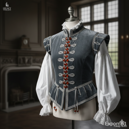 The "Restoration Spirit" Cavalier Doublet is a quintessential garment of the English mid-to-late 17th century, celebrating the return of flamboyant fashion after the somber years of the Commonwealth. This doublet captures the rakish elegance of the court of Charles II, known as the "Merry Monarch." Crafted from heavy slate-grey silk velvet, the doublet features the characteristic shortened waistline and "slashed" sleeves that reveal a voluminous white linen shirt beneath. The seams are reinforced with silver braided trim, and the entire front panel is decorated with intricate "frogging" — decorative cord loops and buttons. The "Legacy Threads" signature element is integrated into the fastenings and the shoulder "points" (decorative ties). The doublet is secured by a row of hand-carved Baltic amber buttons in a deep, translucent "Cherry" hue. Additionally, the silk ribbons at the waist are tipped with "aiglets" (metal tags) made of sterling silver, each capped with a tiny, polished amber bead. This combination of the cool grey velvet and the warm, glowing amber buttons creates a sophisticated look that defines the English gentleman of the Baroque era—bold, refined, and undeniably luxurious. Keywords: English Cavalier doublet, 17th Century Stuart fashion, Restoration era clothing, Charles II style, Slashed sleeves, Baltic amber buttons, Silk velvet garment, Silver embroidery, Historical English menswear, Baroque court attire. _________________________________________________________________________________________________________________________________________ Камзол кавалера «Дух Реставрации» — это квинтэссенция английской моды середины и конца XVII века, воспевающая возвращение пышных нарядов после суровых лет протектората. Этот камзол воплощает беззаботную элегантность двора Карла II, известного как «Веселый монарх». Изготовленный из тяжелого грифельно-серого шелкового бархата, камзол отличается характерной завышенной линией талии и «разрезными» рукавами, сквозь которые видна объемная рубашка из тонкого белого льна. Швы укреплены серебряной тесьмой, а вся передняя панель украшена искусными декоративными петлями и пуговицами. Фирменный элемент Legacy Threads интегрирован в застежки и плечевые «эглеты» (декоративные завязки). Камзол застегивается на ряд вырезанных вручную пуговиц из балтийского янтаря глубокого прозрачного оттенка «Вишня». Кроме того, шелковые ленты на талии снабжены наконечниками из стерлингового серебра, каждый из которых увенчан крошечной полированной янтарной бусиной. Сочетание холодного серого бархата и теплых, сияющих янтарных пуговиц создает утонченный образ, определяющий английского джентльмена эпохи барокко — смелого, изысканного и бесспорно роскошного. Ключевые слова: английский камзол кавалера, мода Стюартов XVII века, одежда эпохи Реставрации, стиль Карла II, разрезные рукава, пуговицы из балтийского янтаря, одежда из шелкового бархата, серебряная вышивка, историческая мужская одежда Англии, придворный наряд в стиле барокко. _______________________________________________________________________________________________________________________________________ expomod.kz