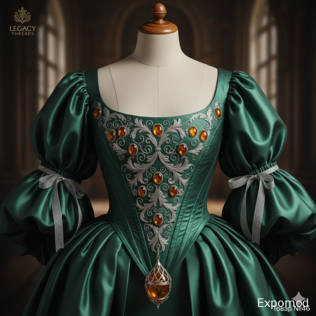 The "Greenwich Shadow" Lady’s Bodice is an exquisite example of English mid-17th-century tailoring, inspired by the portraits of Sir Peter Lely. This bodice reflects the shift from the rigid Elizabethan structures to a softer, more romantic silhouette that defined the Stuart court. Constructed from heavy, lustrous "midnight forest" green silk satin, the bodice is boned internally to create the iconic conical shape of the era, ending in a sharp "V" at the waist. The neckline is wide and low, designed to be worn with a delicate lace partlet or left open to showcase jewelry. The sleeves are voluminous, gathered at the elbow with silver-threaded ribbons. The "Legacy Threads" signature detail is found in the stomacher — the decorative triangular panel at the front. It is hand-embroidered with silver wire in a pattern of scrolling acanthus leaves, and at the center of each scroll sits a polished, circular Baltic amber of the "Honey" variety. A large, drop-shaped amber pendant, encased in a silver filigree cage, hangs from the base of the stomacher, catching the light as the wearer moves. This piece is a masterclass in Baroque elegance, blending the cool, dark tones of English silk with the warm, solar energy of Baltic amber. Keywords: Stuart era bodice, 17th Century English dress, Silk satin bodice, Greenwich fashion, Baroque embroidery, Baltic amber inlay, Historical women's clothing, Silver thread work, Restoration style, Luxury period attire. _____________________________________________________________________________________________________________________________________ Корсаж леди «Тень Гринвича» — это изысканный образец английского портновского искусства середины XVII века, вдохновленный портретами сэра Питера Лели. Этот корсаж отражает переход от жестких елизаветинских структур к более мягкому и романтичному силуэту, который определял облик двора Стюартов. Изготовленный из тяжелого, сияющего шелкового атласа цвета «ночной лес» (темно-зеленый), корсаж имеет внутренние косточки для создания культовой конической формы той эпохи, завершающейся острым мысом (V-образной формой) на талии. Вырез — широкий и низкий, предназначенный для ношения с изящной кружевной вставкой или открытым, чтобы продемонстрировать украшения. Пышные рукава собраны у локтя лентами с серебряной нитью. Фирменная деталь Legacy Threads украшает стомакер — декоративную треугольную панель спереди. Он расшит вручную серебряной канителью в виде завитков листьев аканта, и в центре каждого завитка помещен полированный круглый балтийский янтарь «медового» сорта. Крупная каплевидная янтарная подвеска в серебряной филигранной оправе закреплена у основания стомакера, улавливая свет при каждом движении. Это изделие — мастер-класс элегантности барокко, сочетающий прохладные темные тона английского шелка с теплой солнечной энергией балтийского янтаря. Ключевые слова: корсаж эпохи Стюартов, английское платье XVII века, атласный корсаж, гринвичская мода, вышивка барокко, инкрустация балтийским янтарем, историческая женская одежда, работа серебряной нитью, стиль Реставрации, роскошный старинный наряд. ____________________________________________________________________________________________________________________________________ expomod.kz