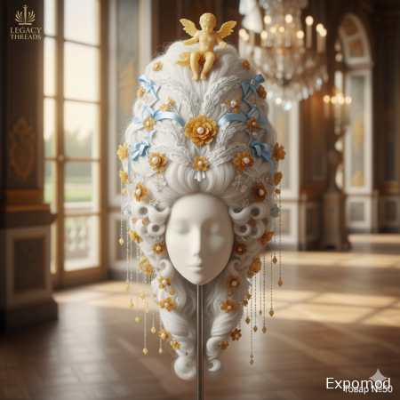 The "Versailles Nymph's Fountain" Wig is a spectacular example of late 18th-century French coiffure, embodying the playful extravagance and artistic ambition of the Rococo era. This particular style, reaching impressive heights, was favored by the most fashionable ladies of the court, reflecting their status and wit. Crafted from fine, powdered human hair, the wig features voluminous curls piled high atop the head, creating a graceful, flowing silhouette reminiscent of a fountain's spray. Soft tendrils frame the face, while the main structure is intricately woven with pale blue silk ribbons and delicate silver-threaded lace. The "Legacy Threads" signature comes alive in the bespoke ornamentation. The wig is adorned with a cascade of hand-carved miniature flowers—roses, lilies, and tiny forget-me-nots—made from polished Baltic amber in a delicate "Lemon" hue. These amber blossoms are nestled amongst the curls and ribbons, some with tiny freshwater pearls at their centers, creating a radiant contrast with the powdered hair. A central, larger amber carving depicting a playful putto (cherub) spills forth a "fountain" of cascading silver chains and tiny amber beads, symbolizing both the natural beauty of the material and the artificial grandeur of the era. This wig is a true statement piece, a blend of natural allure and artisanal fantasy. Keywords: 18th Century French wig, Rococo coiffure, Marie-Antoinette wig, Powdered hair, Baltic amber ornaments, Silver threaded lace, Historical elaborate hairstyle, Versailles fashion accessory, Lemon amber carvings, Putto motif, Luxury period wig. ____________________________________________________________________________________________________________________________________ Парик «Фонтан нимфы Версаля» — это впечатляющий образец французской высокой прически конца XVIII века, воплощающий игривую экстравагантность и художественные амбиции эпохи рококо. Подобные прически, достигавшие невероятной высоты, были излюбленным выбором самых модных придворных дам, подчеркивая их статус и остроумие. Изготовленный из тончайших натуральных волос, покрытых пудрой, парик представляет собой каскад пышных локонов, уложенных высоко на голове, что создает изящный, струящийся силуэт, напоминающий брызги фонтана. Лицо обрамляют мягкие завитки, а основная структура прически искусно переплетена нежно-голубыми шелковыми лентами и тонким кружевом с серебряной нитью. Фирменный стиль Legacy Threads оживает в эксклюзивном декоре. Парик украшен каскадом миниатюрных цветов — роз, лилий и незабудок — вырезанных вручную из полированного балтийского янтаря нежного «лимонного» оттенка. Эти янтарные соцветия уютно расположились среди локонов и лент, а в центре некоторых из них сияют крошечные речные жемчужины, создавая лучистый контраст с напудренными волосами. В центре композиции находится более крупная янтарная резная фигурка игривого путто (купидона), из которой «изливается» фонтан из тонких серебряных цепочек и янтарных бусин. Этот парик — настоящий манифест стиля, сплав природного очарования и ремесленной фантазии. Ключевые слова: французский парик XVIII века, прическа рококо, парик Марии-Антуанетты, напудренные волосы, украшения из балтийского янтаря, кружево с серебряной нитью, историческая сложная прическа, модный аксессуар Версаля, лимонная резьба по янтарю, мотив путто, роскошный парик эпохи. ___________________________________________________________________________________________________________________________________________ expomod.kz