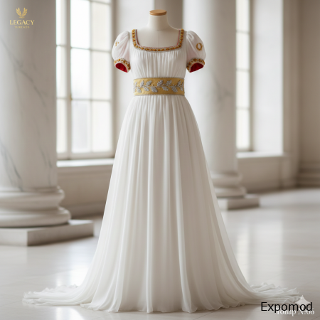 The "General's Daughter" gown embodies the sophisticated elegance of the Empire waistline, reinterpreting military prestige for a lady of distinction. While men wore their uniforms on the battlefield, women of influence often incorporated subtle nods to military themes in their lavish evening wear, celebrating the triumphs of their nation. This gown is crafted from flowing "parade-white" silk mousseline, known for its delicate drape and ethereal quality. The high, fitted bodice features a subtle "victory-red" silk lining peeking through, reminiscent of an officer's sash. The skirt falls gracefully, pooling slightly at the feet, designed for elegant movement at court balls or victory celebrations. The "Legacy Threads" signature transforms this classic silhouette with unique embellishments. The Empire waist is accentuated by a wide sash of "Imperial gold" silk, intricately embroidered with miniature silver oak leaves and tiny "Ice" amber beads that shimmer like frost. The short, puffed sleeves are adorned with delicate "Cherry" amber buttons, carved with tiny laurel wreaths. The décolletage is framed by a subtle trim of "Egg-yolk" amber beads, arranged in a pattern resembling military braid. This dress is a testament to understated power and refined patriotism, allowing a lady to share in the glory of the Grand Armée without donning a uniform herself. Keywords: Empire waist gown, Regency evening dress, Napoleonic women's fashion, Military inspired gown, Silk mousseline dress, Amber beaded embroidery, Victory red lining, Imperial gold sash, 19th-century ladies' formal wear. _______________________________________________________________________________________________________________________________________ Платье «Генеральская дочь» воплощает утонченную элегантность завышенной талии стиля ампир, переосмысливая военный престиж для знатной дамы. В то время как мужчины носили мундиры на полях сражений, влиятельные женщины часто добавляли в свои роскошные вечерние наряды тонкие намеки на военную тематику, празднуя триумфы своей нации. Платье сшито из струящегося шелкового муслина цвета «парадный белый», известного своей нежной драпировкой и воздушностью. Высокий приталенный лиф дополнен едва заметной подкладкой из шелка цвета «победный красный», напоминающей офицерский шарф или ленту. Юбка изящно ниспадает, образуя небольшой шлейф, идеально подходящий для величественных движений на придворных балах или празднованиях побед. Фирменный стиль Legacy Threads преображает этот классический силуэт уникальными деталями. Линия талии подчеркнута широким поясом из шелка цвета «имперское золото», украшенным сложной вышивкой в виде миниатюрных серебряных дубовых листьев и крошечных бусин из «ледяного» янтаря, мерцающих как иней. Короткие рукава-фонарики украшены изящными пуговицами из «вишневого» янтаря с гравировкой в виде лавровых венков. Декольте обрамлено тонкой отделкой из янтарных бусин сорта «Яичный желток», выложенных в узор, напоминающий гусарский бранденбур (военный галун). Это платье — свидетельство скрытой силы и утонченного патриотизма, позволяющее даме разделить славу Великой армии, оставаясь воплощением женственности. Ключевые слова: платье с завышенной талией, вечернее платье эпохи Регентства, женская мода наполеоновской эпохи, платье в военном стиле, шелковое муслиновое платье, вышивка янтарными бусинами, подкладка цвета победный красный, пояс имперское золото, парадная одежда XIX века. _________________________________________________________________________________________________________________________________________ expomod.kz