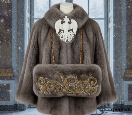 The "Northern Aurora" is a majestic pelerine-muff combination, a piece of high-fashion armor designed for a Russian noblewoman braving the biting winds of a St. Petersburg winter. While the Empire style favored thin muslins, the reality of the Russian climate demanded outer garments of immense warmth and even greater splendor. This garment is crafted from the finest "sable-smoke" faux fur, so soft it mimics the legendary Russian sable. It features a wide, dramatic shoulder cape (pelerine) that transitions into a plush, oversized muff to protect delicate hands during long troika rides or walks along the frozen Neva. The "Legacy Threads" signature transforms this winter essential into a regal statement. The pelerine is fastened with a heavy, ornate brooch made of a single, massive piece of "Royal White" amber, intricately carved with the likeness of a Firebird from Russian folklore. The muff is adorned with "Imperial gold" embroidery that winds like frost-covered vines, with hundreds of tiny "Ice" amber beads sewn into the pattern to catch the pale winter sun. The interior of the muff is lined with "victory-red" silk, a hidden nod to the military pride of the era. To complete the ensemble, a long, delicate chain of "Honey" amber beads allows the muff to hang elegantly from the neck, ensuring it is never misplaced at a grand ball. Keywords: Russian Empire winter fashion, Pelerine with muff, Sable-style fur, Firebird amber carving, Royal White amber brooch, Gold frost embroidery, 19th-century Russian ladies' wear, Luxury winter accessory, Regency era outerwear ____________________________________________________________________________________________________________________________________________ Муфта-палантин «Северная Аврора» — это величественное сочетание пелерины и муфты, настоящий шедевр «модной брони», созданный для русской аристократки, бросающей вызов кусачим ветрам зимнего Санкт-Петербурга. Хотя стиль ампир благоволил тонкому муслину, суровая реальность российского климата требовала верхней одежды, обладающей невероятным теплом и еще большим великолепием. Изделие выполнено из тончайшего искусственного меха цвета «соболиный дым», настолько мягкого, что он имитирует легендарного русского соболя. Широкая, эффектная накидка на плечи (пелерина) переходит в пышную, объемную муфту, призванную защитить нежные руки во время долгих поездок на тройке или прогулок вдоль замерзшей Невы. Фирменный стиль Legacy Threads превращает этот зимний предмет первой необходимости в королевский атрибут. Пелерина застегивается на тяжелую массивную брошь из цельного куска «королевского белого» янтаря с филигранной резьбой в виде Жар-птицы из русского фольклора. Муфта украшена вышивкой «имперским золотом», которая вьется, словно покрытые инеем лозы, а сотни крошечных бусин из «ледяного» янтаря вшиты в узор, чтобы ловить бледное зимнее солнце. Внутри муфта подбита шелком цвета «победный красный» — скрытый кивок в сторону военной гордости той эпохи. Завершает ансамбль длинная изящная цепочка из бусин «медового» янтаря, позволяющая муфте элегантно свисать с шеи, чтобы она никогда не потерялась на большом балу. Ключевые слова: зимняя мода Российской империи, пелерина с муфтой, мех под соболя, резьба по янтарю Жар-птица, брошь из белого янтаря, золотая морозная вышивка, женская одежда XIX века, роскошный зимний аксессуар, верхняя одежда эпохи Регентства. ____________________________________________________________________________________________________________________________________________ expomod.kz