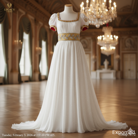The "Breath of Aphrodite" is a sublime ball gown, meticulously crafted to capture the ethereal beauty and refined elegance of the early 19th-century Empire silhouette. Designed for grand entrances at the most illustrious European courts, this dress is a celebration of delicate materials and understated luxury. The gown is made from multiple layers of "moonlit-ivory" silk chiffon, creating a translucent, flowing effect that gracefully cascades from the high empire waist. The sheer sleeves are short and puffed, gathered just above the elbow with a delicate ribbon. The décolletage is a modest square neckline, subtly emphasizing the collarbones. The "Legacy Threads" signature transforms this classical design into a masterpiece of subtle sparkle. The entire dress is subtly embroidered with thousands of microscopic "Ice" amber beads, so tiny they are almost invisible, but catch the candlelight with a delicate, frosty shimmer, as if dew-kissed. The empire waistline is defined by a wide band of "Honey" amber beads, intricately woven into a pattern of delicate grapevines, symbolizing abundance and joy. The ribbons on the sleeves are tipped with small, polished "Cherry" amber cabochons, adding a touch of warm color. A sweeping train adds to the dramatic, goddess-like silhouette, ensuring every step is a glide. Keywords: Empire waist ball gown, 19th-century evening dress, Silk chiffon dress, Ivory classical gown, Ice amber embroidery, Honey amber detailing, Regency era fashion, Goddess silhouette dress, Luxury formal wear ____________________________________________________________________________________________________________________________________________ Бальное платье «Дыхание Афродиты» — это возвышенное творение, скрупулезно созданное, чтобы запечатлеть неземную красоту и утонченную элегантность силуэта ампир начала XIX века. Предназначенное для торжественных выходов при самых прославленных европейских дворах, это платье является торжеством нежных материалов и сдержанной роскоши. Платье выполнено из нескольких слоев шелкового шифона цвета «слоновая кость в лунном свете», создающего полупрозрачный, струящийся эффект, грациозно ниспадающий от высокой линии талии. Короткие рукава-фонарики собраны чуть выше локтя изящной лентой. Скромное квадратное декольте тонко подчеркивает линию ключиц. Фирменный стиль Legacy Threads превращает этот классический дизайн в шедевр едва уловимого сияния. Все платье украшено вышивкой из тысяч микроскопических бусин «ледяного» янтаря — настолько крошечных, что они почти невидимы, но в свете свечей вспыхивают нежным морозным мерцанием, подобно утренней росе. Линия талии подчеркнута широким поясом из «медового» янтаря, искусно вплетенного в узор из виноградных лоз, символизирующих изобилие и радость. Ленты на рукавах украшены небольшими полированными кабошонами из «вишневого» янтаря, добавляющими капельку теплого цвета. Длинный шлейф завершает драматичный образ богини, превращая каждый шаг в полет. Ключевые слова: бальное платье ампир, вечернее платье XIX века, платье из шелкового шифона, классическое платье цвета слоновой кости, вышивка ледяным янтарем, детали из медового янтаря, мода эпохи Регентства, силуэт богини, роскошная официальная одежда. ____________________________________________________________________________________________________________________________________________ expomod.kz