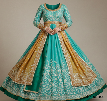 The "Celestial Dew of Udaipur" is an exquisite saree, reflecting the opulent elegance of Rajasthani royalty in the early 19th century. This garment is a testament to the unparalleled skill of Indian weavers and embroiderers, designed for a queen or high-ranking noblewoman attending a grand court ceremony. The saree is crafted from "Jamdani" muslin, celebrated for its lightness and the intricate patterns woven directly into the fabric during the weaving process. The base color is a vibrant "peacock-teal," reminiscent of the jewel tones favored by the Rajput courts. The entire fabric is adorned with a delicate, scattered pattern of tiny silver "buta" (paisley) motifs, shimmering subtly with every movement. The "Legacy Threads" signature transforms this traditional masterpiece into an amber-infused wonder. The "pallu" (decorative end piece) is bordered with a wide, hand-embroidered band of "kundan" work, setting hundreds of polished "Royal White" amber cabochons and "Ice" amber chips in intricate floral designs. These simulate droplets of morning dew on lotus petals. The body of the saree features scattered "Honey" amber beads, sewn in the shape of tiny starbursts. To complete the ensemble, a matching "choli" (blouse) features delicate "Cherry" amber embroidery along its neckline and short sleeves, adding a touch of warm contrast to the cool teal. This saree is a flowing cascade of color and light, designed to mesmerize. Keywords: Indian Saree, Rajasthani royalty fashion, 19th-century noble attire, Jamdani muslin, Peacock teal, Kundan work, Royal White amber, Ice amber dew drops, Honey amber starbursts, Traditional Indian women's wear. ____________________________________________________________________________________________________________________________________________ Сари «Небесные росы Удайпура» — это изысканное сари, отражающее роскошную элегантность раджастанской знати начала XIX века. Это одеяние является свидетельством беспрецедентного мастерства индийских ткачей и вышивальщиц, предназначенное для королевы или высокопоставленной дворянки, присутствующей на грандиозной придворной церемонии. Сари изготовлено из муслина «Джамдани», прославленного своей легкостью и сложными узорами, вплетенными непосредственно в ткань в процессе ткачества. Базовый цвет — яркий «павлиний бирюзовый», напоминающий драгоценные оттенки, любимые раджпутскими дворами. Вся ткань украшена тонким, разбросанным узором из крошечных серебряных мотивов «бута» (пейсли), тонко мерцающих при каждом движении. Фирменный стиль Legacy Threads превращает этот традиционный шедевр в чудо, наполненное янтарем. «Паллу» (декоративный конец) оторочен широкой, вышитой вручную полосой в технике «кундан», где сотни полированных кабошонов «королевского белого» янтаря и осколков «ледяного» янтаря вставлены в сложные цветочные узоры. Они имитируют капли утренней росы на лепестках лотоса. По всему полотну сари разбросаны бусины из «медового» янтаря, вышитые в форме крошечных звездных вспышек. Завершает ансамбль подходящая «чоли» (блузка) с изящной вышивкой из «вишневого» янтаря вдоль выреза и коротких рукавов, добавляя теплый контраст к прохладному бирюзовому цвету. Это сари — струящийся каскад цвета и света, призванный завораживать. Ключевые слова: индийское сари, мода раджастанской знати, придворный наряд XIX века, муслин Джамдани, павлиний бирюзовый цвет, работа кундан, белый королевский янтарь, капли росы изо льда, янтарные звездочки медового цвета, традиционная индийская женская одежда ____________________________________________________________________________________________________________________________________________ expomod.kz