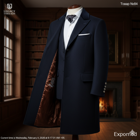 The "Northern Bastion" Chesterfield coat is a definitive piece of mid-19th century outerwear, introducing the streamlined elegance that would define the Victorian businessman. Unlike the waist-seamed frock coats, the Chesterfield offered a straighter, more modern cut, suitable for wearing over a full suit. The coat is crafted from heavy, double-faced "midnight navy" Melton wool, prized for its wind-resistant and water-repellent properties. It features the classic velvet collar in a matching dark hue—a hallmark of the Chesterfield style. The silhouette is long, hitting just below the knee, with a fly-front closure that hides the buttons for a clean, minimalist aesthetic. Two deep side pockets with flaps and a single chest welt pocket provide functional elegance. The "Legacy Threads" signature integrates Baltic amber with military-grade precision. The hidden closure features interior buttons carved from matte "Black Oak" amber (a rare, dark variety), while the sleeve cuffs are adorned with three visible buttons of polished "Royal White" amber, providing a sharp contrast against the navy wool. The interior is lined with quilted "Copper" amber silk, featuring an embroidered "Legacy Threads" crest in silver thread. This coat is an armor of sophistication for the Victorian winter. Keywords: Victorian Chesterfield coat, 1850s outerwear, Midnight navy Melton wool, Velvet collar coat, Royal White amber buttons, Black Oak amber details, Gentleman's overcoat, Business attire 19th century. ____________________________________________________________________________________________________________________________________________ Пальто-честерфилд «Северный бастион» — это знаковый предмет верхней одежды середины XIX века, представляющий ту обтекаемую элегантность, которая стала визитной карточкой викторианского делового человека. В отличие от сюртуков с отрезной талией, честерфилд предлагал более прямой и современный крой, подходящий для ношения поверх полного костюма. Пальто сшито из тяжелой двусторонней шерсти «мелтон» цвета «полуночный синий», которая ценится за ветрозащитные и водоотталкивающие свойства. Оно дополнено классическим бархатным воротником в тон — отличительной чертой стиля Честерфилд. Силуэт длинный, чуть ниже колена, с супатной (скрытой) застежкой, которая прячет пуговицы для создания чистой, минималистичной эстетики. Два глубоких боковых кармана с клапанами и нагрудный карман с листочкой обеспечивают функциональную элегантность. Фирменный стиль Legacy Threads интегрирует балтийский янтарь с военной точностью. Скрытая застежка дополнена внутренними пуговицами, вырезанными из матового янтаря «черный дуб» (редкий темный сорт), а манжеты рукавов украшены тремя видимыми пуговицами из полированного «королевского белого» янтаря, создающими резкий контраст на фоне темно-синей шерсти. Внутри пальто подбито стеганым шелком цвета «медного» янтаря с вышитым серебряной нитью гербом Legacy Threads. Это пальто — доспехи изысканности для викторианской зимы. Ключевые слова: викторианское пальто честерфилд, верхняя одежда 1850-х годов, темно-синяя шерсть мелтон, пальто с бархатным воротником, пуговицы из королевского белого янтаря, детали из янтаря «черный дуб», мужское пальто, деловой стиль XIX века ____________________________________________________________________________________________________________________________________________ expomod.kz