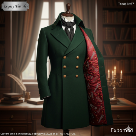 The "Lyceum Dandy" Frock Coat is a meticulously recreated piece inspired by the sartorial elegance of the Russian Romantic era, specifically the 1820s-1830s, a period famously associated with Alexander Pushkin's youth and flourishing literary career. This coat embodies the sophisticated yet understated grandeur of a St. Petersburg gentleman. The frock coat is tailored from a luxurious "dark forest green" fine-grade broadcloth, a dense, smooth wool fabric favored for its rich drape and warmth. It features a high, standing collar (often worn with a cravat) and broad, sweeping lapels that extend to the waist. The cut is fitted through the chest and waist, gracefully flaring into tails that reach just above the knee. The sleeves are long and narrow, ending with elegant buttoned cuffs. The overall silhouette is classic for the era, emphasizing a distinguished and refined posture. The "Legacy Threads" signature adds a bespoke touch of Baltic amber. The double row of front buttons is crafted from polished "Cognac" amber, each button featuring a subtly carved laurel wreath motif—a nod to poetic achievement. The interior lining is a striking "Imperial Red" silk, hand-embroidered with a delicate pattern of stylized quill pens and paper scrolls in silver thread, interspersed with tiny "Butterscotch" amber beads that glint like drops of ink. This frock coat is a tribute to poetic genius and timeless style. Keywords: Russian Romantic era frock coat, 1820s-1830s menswear, Pushkin era fashion, Dark forest green broadcloth, Cognac amber buttons, Laurel wreath motif, Imperial Red silk lining, Butterscotch amber beads, Gentleman's formal coat. ____________________________________________________________________________________________________________________________________________ Парадный сюртук «Лицейский денди» — это тщательно воссозданное изделие, вдохновленное портновской элегантностью русской эпохи романтизма, а именно 1820-1830-х годов, периода, который тесно связан с юностью Александра Пушкина и расцветом его литературной карьеры. Этот сюртук воплощает утонченное, но сдержанное величие петербургского джентльмена. Сюртук сшит из роскошного «темно-лесного зеленого» сукна тончайшего качества — плотной, гладкой шерстяной ткани, ценимой за богатый драпировочный эффект и тепло. Он имеет высокий стоячий воротник (часто носимый с галстуком-пластроном) и широкие, расходящиеся лацканы, доходящие до талии. Крой приталенный в области груди и талии, изящно расширяющийся в фалды, доходящие чуть выше колена. Рукава длинные и узкие, заканчивающиеся элегантными манжетами на пуговицах. Общий силуэт классический для той эпохи, подчеркивающий благородную и изысканную осанку. Фирменный стиль Legacy Threads добавляет индивидуальный штрих балтийского янтаря. Двойной ряд передних пуговиц выполнен из полированного янтаря цвета «коньяк», каждая пуговица украшена тонко выгравированным мотивом лаврового венка — дань поэтическому достижению. Внутренняя подкладка из эффектного «имперского красного» шелка, вручную вышитого тонким узором стилизованных гусиных перьев и свитков в серебряной нити, перемежается крошечными бусинами из янтаря «сливочное масло», мерцающими, как капли чернил. Этот сюртук — дань поэтическому гению и вневременному стилю. Ключевые слова: сюртук русской эпохи романтизма, мужская мода 1820-1830-х годов, мода пушкинской эпохи, темно-зеленое сукно, пуговицы из коньячного янтаря, мотив лаврового венка, подкладка из имперского красного шелка, бусины из янтарного масла, мужское парадное пальто ____________________________________________________________________________________________________________________________________________ expomod.kz