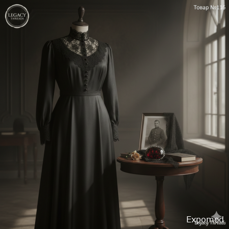 The "Eternal Remembrance" gown is a solemn masterpiece reflecting the quiet dignity of a generation in mourning. In an era of unprecedented loss, the rigid Victorian mourning codes softened into a simpler, yet profoundly elegant silhouette known as the "War Crinoline" (a misnomer for the slightly flared, shorter skirts of the late 1910s). The gown is tailored from matte "midnight charcoal" silk crepe and fine English crape—a fabric specifically chosen for its non-reflective quality, symbolizing the absence of joy. The bodice features a high neck of delicate black Chantilly lace and long, tapered sleeves. The silhouette is streamlined, with a natural waistline accentuated by a wide sash of dull-finished silk. The "Legacy Threads" signature manifests through the only jewelry permitted during deep mourning: black amber. The gown is fastened at the throat with a magnificent "Night Velvet" Baltic Amber brooch—a rare, naturally black variety of amber that, when held to the light, reveals a deep, hidden wine-red heart. The cuffs are adorned with small, faceted "Obsidian Smoke" amber buttons, their dark sparkle providing a subtle, respectful luster. This ensemble is not just a garment of sorrow, but a testament to the strength and resilience of the women who carried the memory of the fallen. Keywords: WWI Mourning dress, 1910s widow's weeds, Black silk crepe gown, Chantilly lace, Black Baltic Amber jewelry, Night Velvet amber, Historical mourning etiquette, War Crinoline era. Price: $34,000 Этап 2: Перевод на русский язык Ансамбль «Вечная Память» — это торжественный шедевр, отражающий тихое достоинство поколения, погруженного в траур. В эпоху беспрецедентных потерь жесткие викторианские каноны траура сменились более простым, но глубоко элегантным силуэтом, известным как «военный кринолин» (ироничное название слегка расклешенных и укороченных юбок конца 1910-х). Платье сшито из матового шелкового крепа цвета «полночный уголь» и тонкого английского крепа — ткани, специально выбранной за ее неспособность отражать свет, что символизировало отсутствие радости. Лиф украшен высоким воротником из деликатного черного кружева шантильи и длинными зауженными рукавами. Силуэт лаконичный, с естественной линией талии, подчеркнутой широким кушаком из матового шелка. Фирменный стиль Legacy Threads проявляется в единственных украшениях, допустимых в период глубокого траура — черном янтаре. Платье застегивается у горла великолепной брошью из балтийского янтаря «Ночной бархат» — редкой, природно-черной разновидности, которая на просвет открывает глубокое, скрытое винно-красное сердце. Манжеты украшены маленькими гранеными пуговицами из янтаря «Обсидиановый дым», чей темный блеск создает сдержанное, почтительное сияние. Этот ансамбль — не просто одежда скорби, но свидетельство силы и стойкости женщин, хранивших память о павших. Ключевые слова: траурное платье ПМВ, вдовьи одежды 1910-х, черное шелковое платье, кружево шантильи, украшения из черного янтаря, янтарь «Ночной бархат», исторический траурный этикет ____________________________________________________________________________________________________________________________________________ expomod.kz
