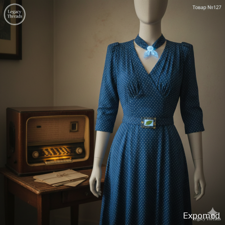 The "Blue Kerchief" tea dress is an evocative piece that captures the bittersweet nostalgia of the mid-1940s. Named after the legendary wartime song, it represents the promise of return and the enduring grace of women waiting for peace. It is a dress for a quiet evening by the radio or a hopeful stroll through a city park during a rare moment of calm. The dress is tailored from a fluid "Midnight Azure" rayon crepe, adorned with a delicate white polka-dot pattern—a timeless print that offered a sense of normalcy during the chaotic war years. The silhouette features the classic 1940s strong shoulder line and a pleated bodice that flows into a knee-length flared skirt, designed to catch the air with every step. The "Legacy Threads" signature element is a masterpiece of intricate amber work. Instead of a traditional brooch, the neckline is adorned with a "Spirit of Hope" Amber Clip. This ornament is fashioned from rare "Blue-Mist" Baltic amber—a variety with a natural bluish tint caused by microscopic inclusions, making it look like a piece of the sky caught in stone. The clip is carved into the shape of a delicate, fluttering silk scarf. Additionally, the waist is cinched by a belt with a buckle made of "Ice-Water" clear amber, containing a single, perfectly preserved ancient leaf, symbolizing the cycle of life and renewal. Keywords: 1940s polka-dot dress, Blue tea dress, Wartime nostalgia, Rayon crepe fashion, Blue Baltic Amber, 1940s silhouette, Vintage Soviet style, Symbolic amber jewelry. ____________________________________________________________________________________________________________________________________________ Чайное платье «Синий Платочек» — это выразительная вещь, запечатлевшая горько-сладкую ностальгию середины 1940-х годов. Названное в честь легендарной песни военных лет, оно олицетворяет обещание возвращения и неувядающую грацию женщин, ждущих мира. Это платье для тихого вечера у радиоприемника или обнадеживающей прогулки в городском парке в редкий момент затишья. Платье сшито из струящегося вискозного крепа цвета «Полуночная лазурь», украшенного нежным белым узором «в горошек» — вневременным принтом, который дарил ощущение нормальности в хаотичные военные годы. Силуэт отличается классической для 1940-х сильной линией плеч и плиссированным лифом, переходящим в расклешенную юбку длиной до колена, созданную для того, чтобы ловить воздух при каждом шаге. Фирменный элемент Legacy Threads — это шедевр сложной работы по янтарю. Вместо традиционной броши вырез украшен янтарным зажимом «Дух Надежды». Это украшение выполнено из редкого балтийского янтаря «Голубой туман» — сорта с естественным синеватым оттенком, вызванным микроскопическими включениями, что делает его похожим на кусочек неба, застывший в камне. Зажим вырезан в форме нежного, развевающегося шелкового платка. Кроме того, талия подчеркнута поясом с пряжкой из прозрачного янтаря «Ледяная вода», внутри которого застыл идеально сохранившийся древний лист — символ жизненного цикла и обновления. Ключевые слова: платье в горошек 1940-х, синее чайное платье, ностальгия военного времени, вискозный креп, голубой балтийский янтарь, силуэт 1940-х, винтажный советский стиль ____________________________________________________________________________________________________________________________________________ expomod.kz